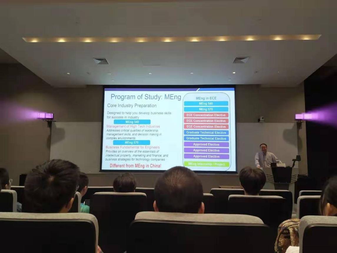 随后,师生来到IB讲座报告厅,聆听李昕教授的报告《Opportunities of ECE Master’s Education at DKU》。李昕教授为讲述了杜克大学的国际地位及校园环境以及杜克大学ECE的众多机会和前景。李教授还以杜克大学学生的就业等各项数据为例讲解了学生在国内外实习和就业的机会。