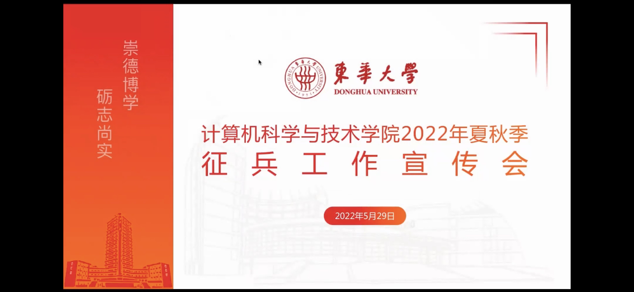 为鼓励广大学生参军入伍报效祖国,投身国防和现代化建设,龙8-long8(头号玩家)国际唯一官方网站计算机学院于2022年5月29日在线上召开了“携笔从戎,强国有我”2022年夏秋季征兵宣讲会。本次宣讲会由计算机学院辅导员彭湘陵老师主持,计算机学院党委副书记李华婷老师,武装部姚洁老师,学院各年级专兼职辅导员老师,以及学院所有适龄男同学们共同参加了此次宣讲会。