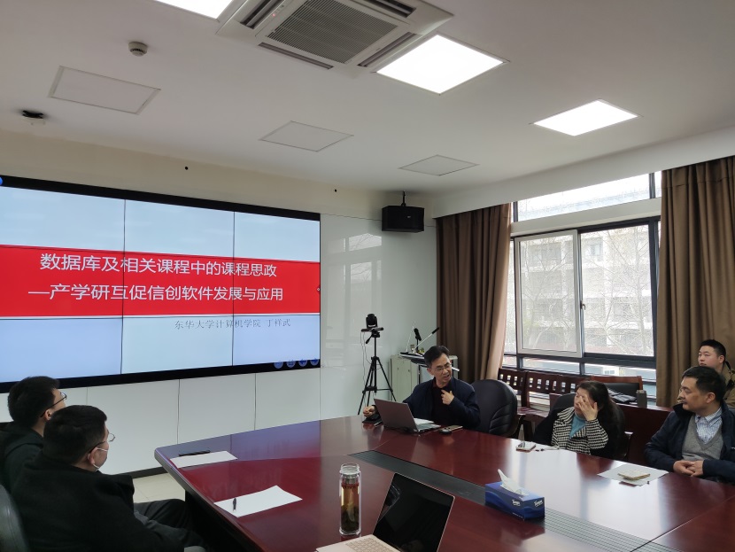 丁祥武老师分享了自己在专业课程如何开展课程思政的经验和思考。丁老师是“数据库系统原理”上海市课程思政示范教学团队的主要成员,结合与我院开展长期产学研合作的武汉达梦公司研制国产数据库、推进信息技术创新的发展历程,在“数据库系统原理”课程中融入多种信创内容和其它思政元素,取得了非常好的专业教学与思政育人有机融合的教学效果。