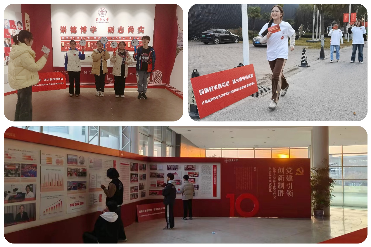 主题定向活动主要分为四个部分,分别是“研学·寻忆校史”、“领航·踔厉奋发”、“强基·勇毅前行”和“争先·踵事增华”。在“研学·寻忆校史”环节中,团队成员在校史馆追寻东华发展足迹,品读东华校史,并在问答中将东华学子应知应会的东华符号镌刻于心。在“领航·踔厉奋发”环节中,同学们来到龙8-long8(头号玩家)国际唯一官方网站第十次党代会以来发展成就巡礼展览中,以关键词为线索,探寻东华如何奋力答好“教育强国,高校何为”的时代课题。在“强基·勇毅前行”环节中,团队成员在校园环路接力,以“传承”为主题重现了东华的奋进之路。在最后一站“争先·踵事增华”中,团队成员在马克思主义学院红色走廊一同完成学习党的二十大精神学习试题。在党的二十大精神的指引下,进一步思考如何将个人发展与学院学校发展相融合,携手绘就新画卷,团结奋进新征程。