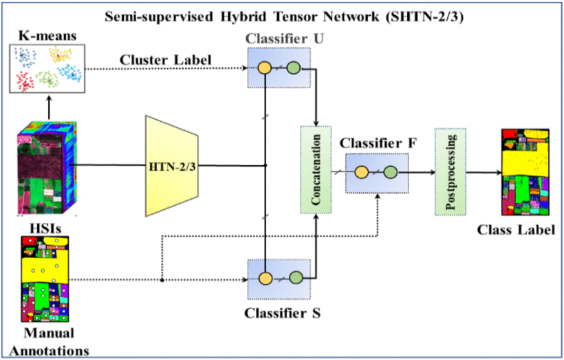该工作基于农田、城市等地物的高光谱遥感图像,提出全监督和半监督张量混合网络。除了高维图像的数据冗余性,对地高光谱遥感图像还存在其他两个问题:光谱变异性和标注稀缺性。受制于硬件条件,图像的空间分辨率和光谱分辨率相互制约,因此高光谱遥感图像具有光谱变异性,表现为“异物同谱”和“同谱异物”现象,给地物识别造成困难。对地遥感成像一般覆盖广袤区域,而逐像素精准人工标注需要实地勘测且费时费力,这种矛盾导致标注稀缺性。为解决以上问题,本工作利用张量分析和卷积网络的数学相通性,将张量分析和卷积池化深度混合,构建多种张量混合网络,表达不同形式的空谱特征;提出全监督和半监督学习框架,将构造的网络嵌入其中,分别满足精准标注和稀缺标注条件下的地物识别需求。提出的张量混合网络结构以及全/半监督地物分类框架如下图所示。此工作发表在SCI二区期刊IEEE Journal of Selected Topics in Applied Earth Observations and Remote Sensing,标题为Hybrid Tensor Networks for Fully Supervised and Semisupervised Hyperspectral Image Classification,一作为研究生修亚辉,通讯作者为陈昭老师。