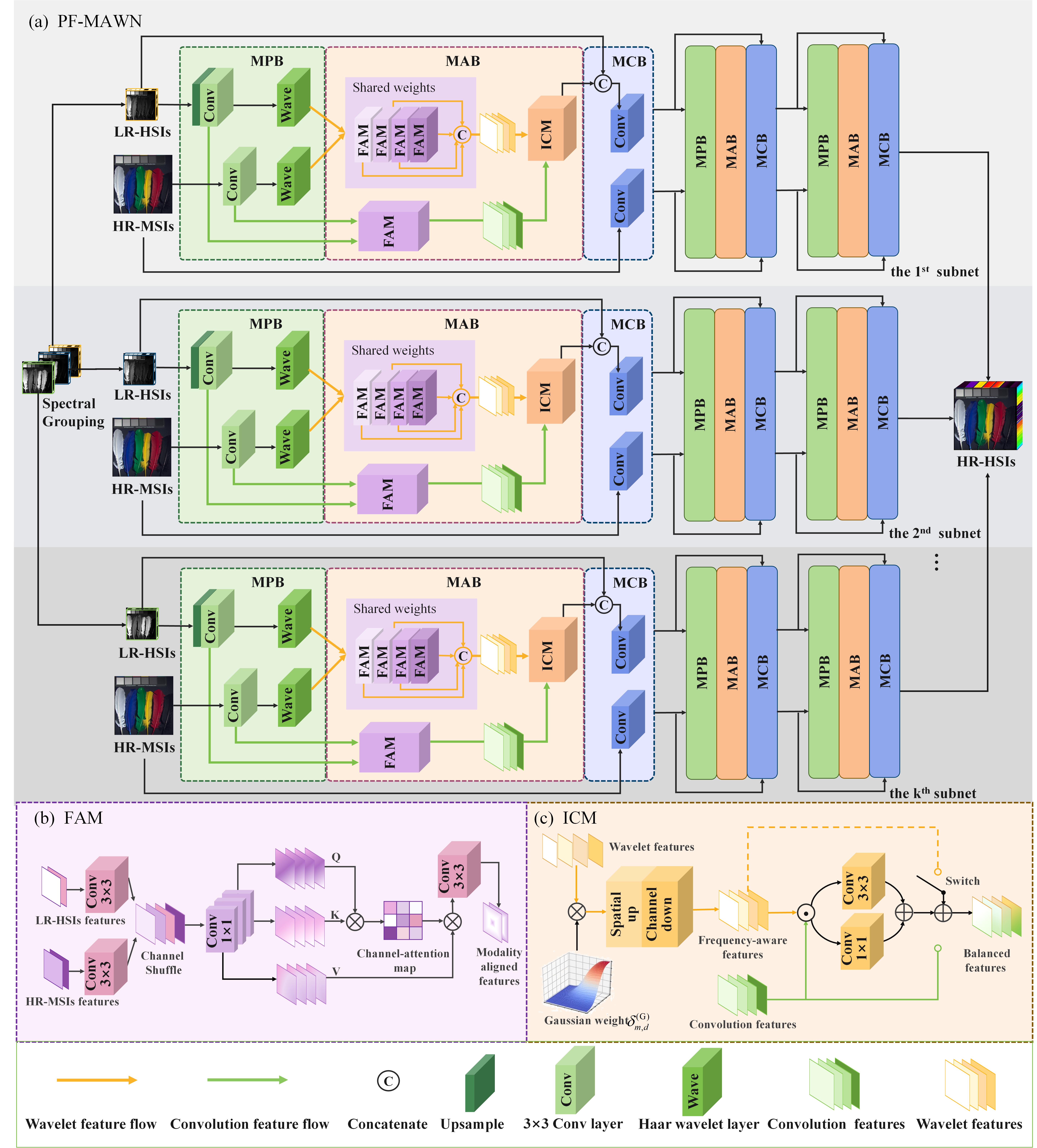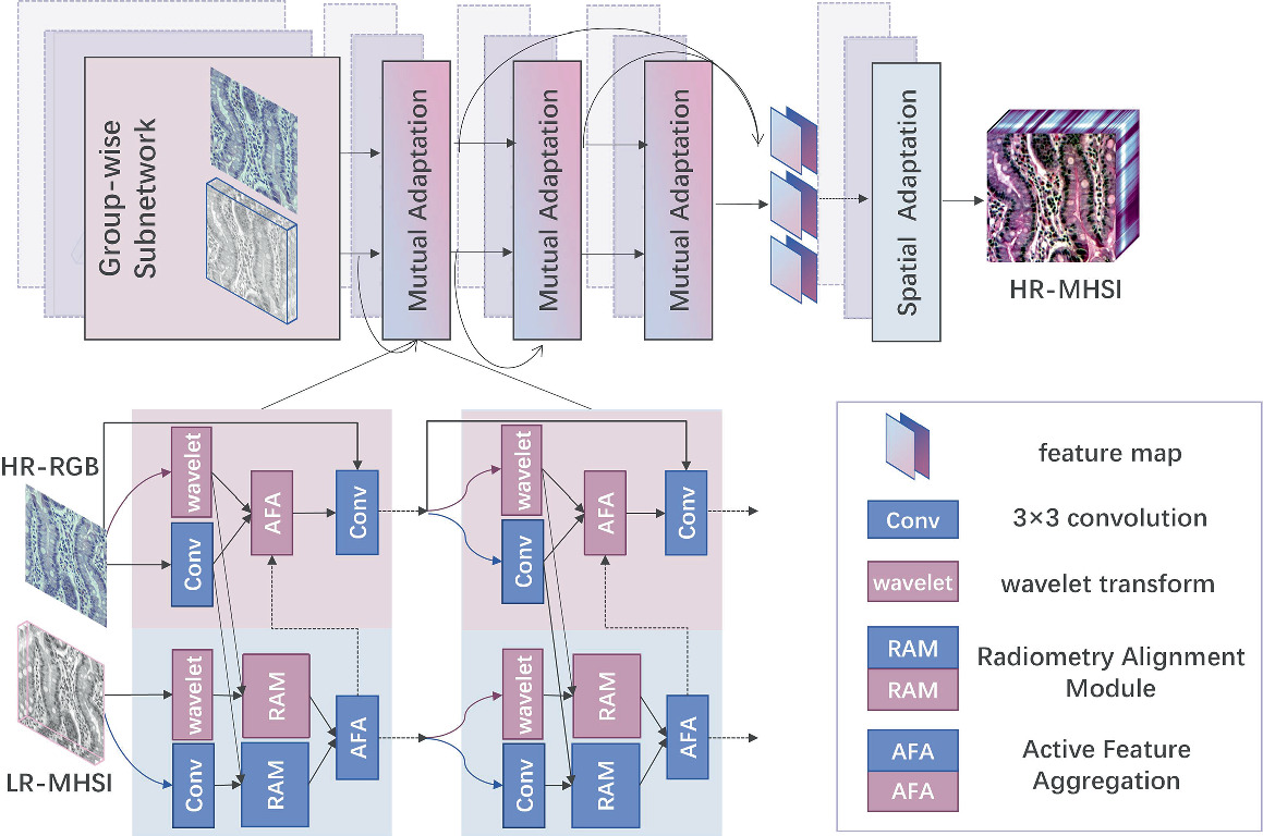 该工作为小波卷积融合网络提供一个医学应用范例:显微高光谱病理图像增强。所得到的高空间分辨率和高光谱分辨率显微病理图像,能够更好地反应细胞和组织细节特征,为肿瘤识别与预后提供数据支持。基于小波卷积网络的显微高光谱病理图像增强框架如下图所示。此工作发表在生物医学图像处理权威会议ECCV 2022 Workshop: CDPath,标题为A Deep Wavelet Network for High-Resolution Microscopy Hyperspectral Image Reconstruction,一作为王倩老师,通讯作者为陈昭老师。