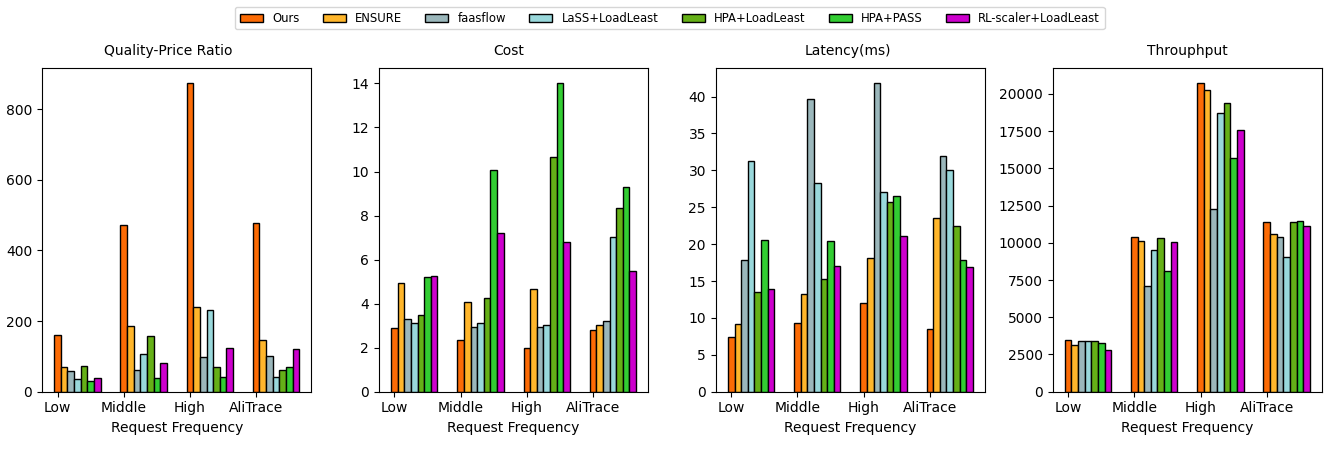 实验结果表明,本研究提出的扩缩容与调度协同机制在多个性能指标上均显著优于现有方案,特别是在吞吐量、成本与延迟的权衡方面表现出色。