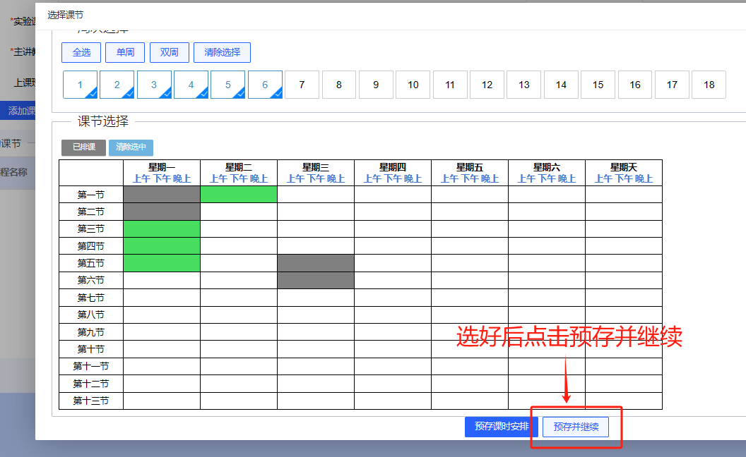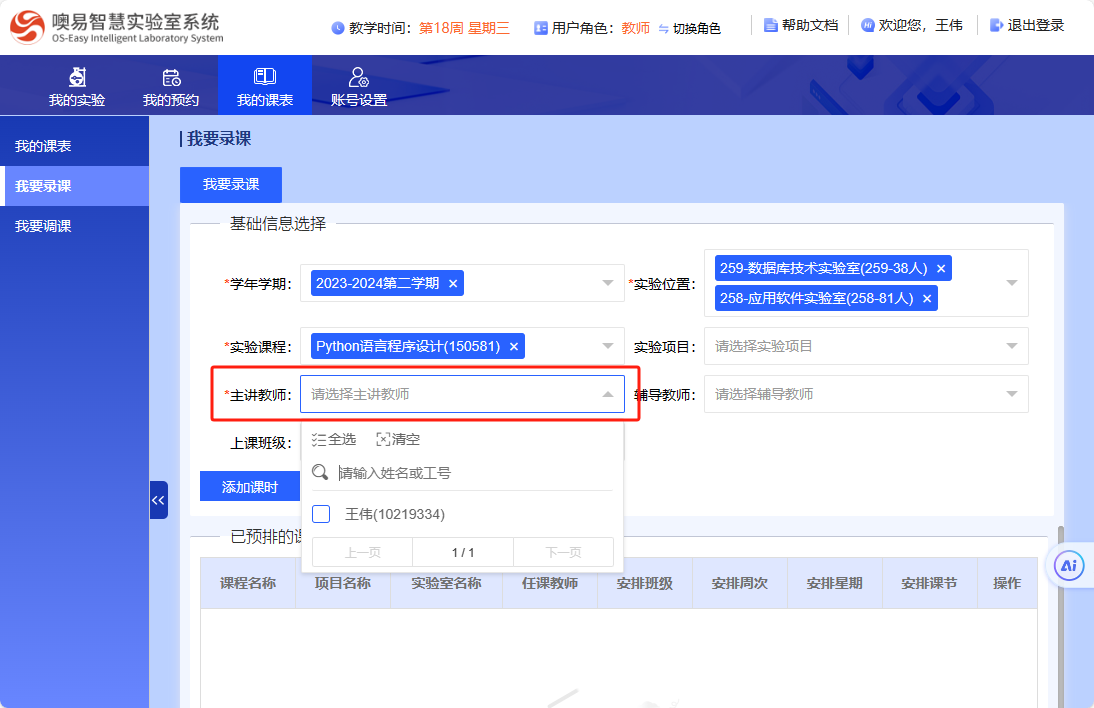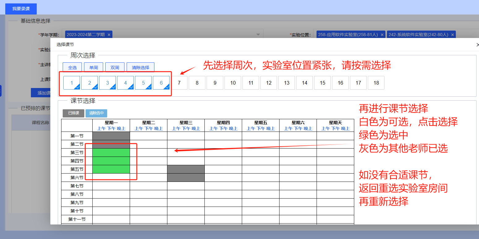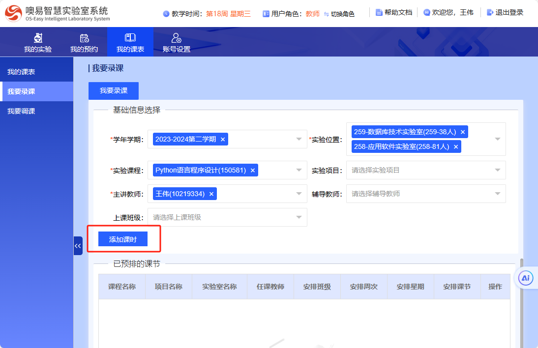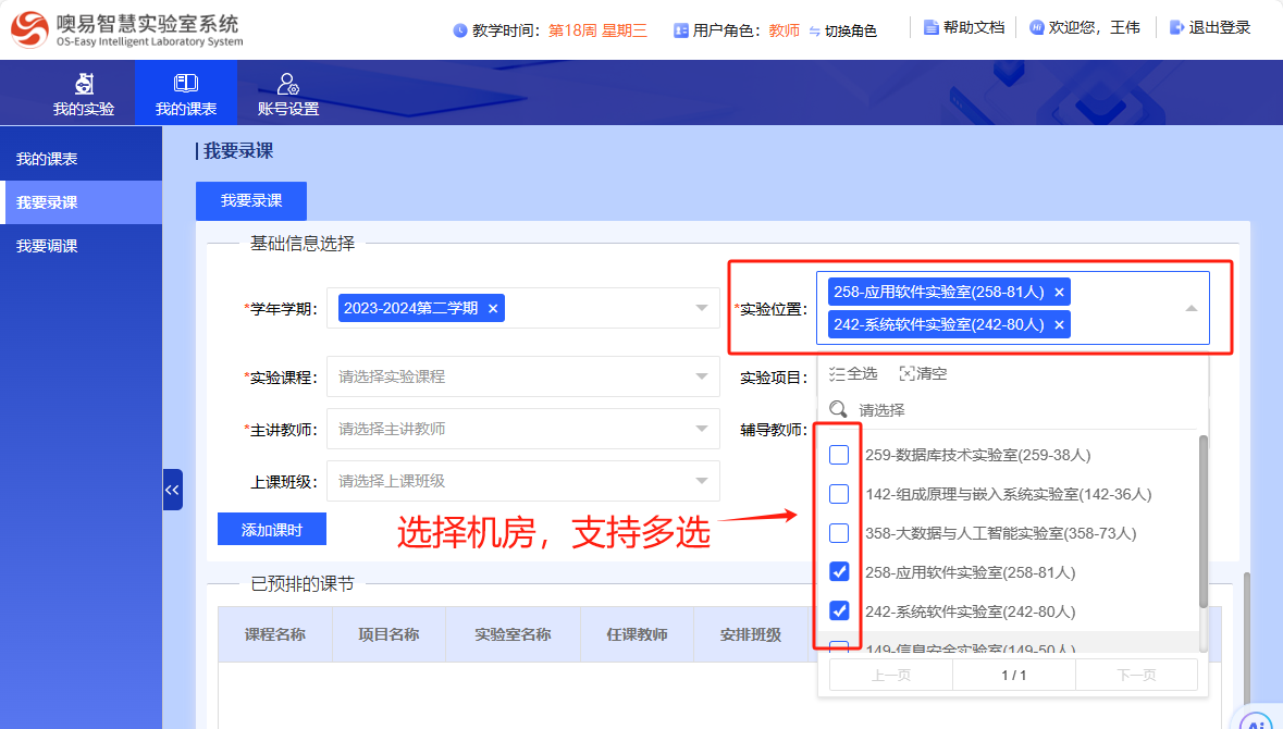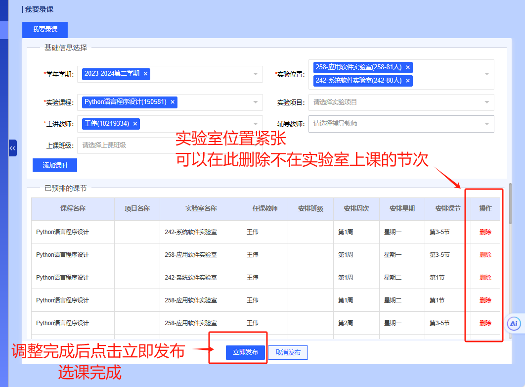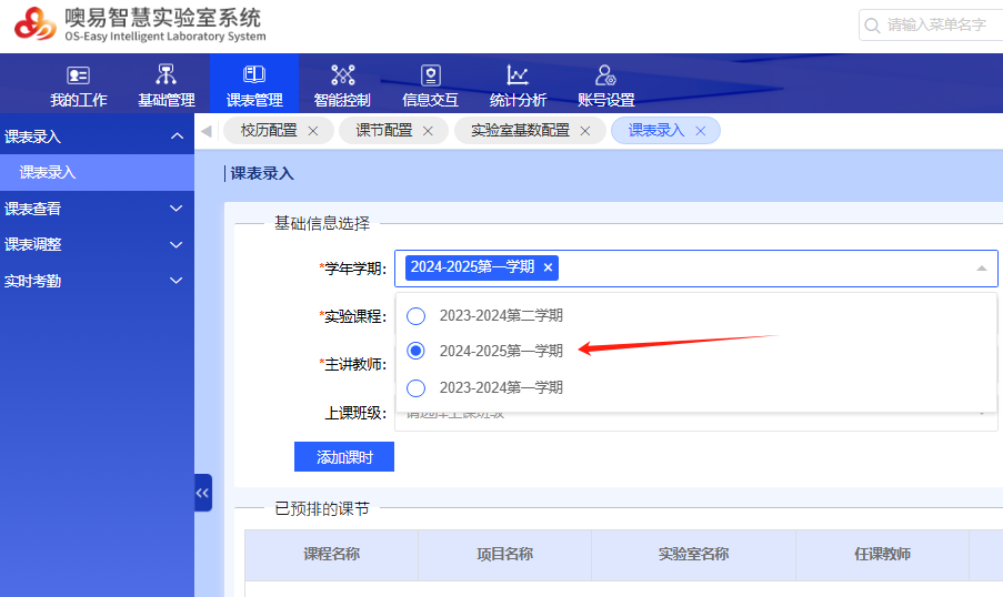 三、依次选择学期>> 实验室位置(支持多选)>> 实验课程(如未搜到课程可以选择<实验课>)>> 主讲教师>> 添加课时>> 发布