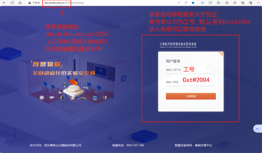 系统网址http://lab.www.akharlamova.com:2050/校外访问需要使用VPN(VPN主机请使用vpn.dhu.edu.cn图书馆的vip.dhu.edu.cn无法访问选课系统)