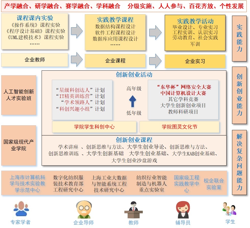 成效层面,从完善教学体系、强化教学保障、改革教学模式等三个维度落实:构建计算机大类专业大纺织特色课程体系和全校计算机通识教学AI+课程体系,加强实验教学,实现理论知识、实验和课程思政有机统一;制定23项制度文件,投入千余万元经费全面改造提升实验室软硬件,开设了800余项实验,覆盖67个专业十万人次学生,年教学人时数逾42万;成立学生科创中心,实施“学术领路人”等四个计划,组织了19项学科竞赛,实现第一课堂教学与第二课堂实践创新活动联动。